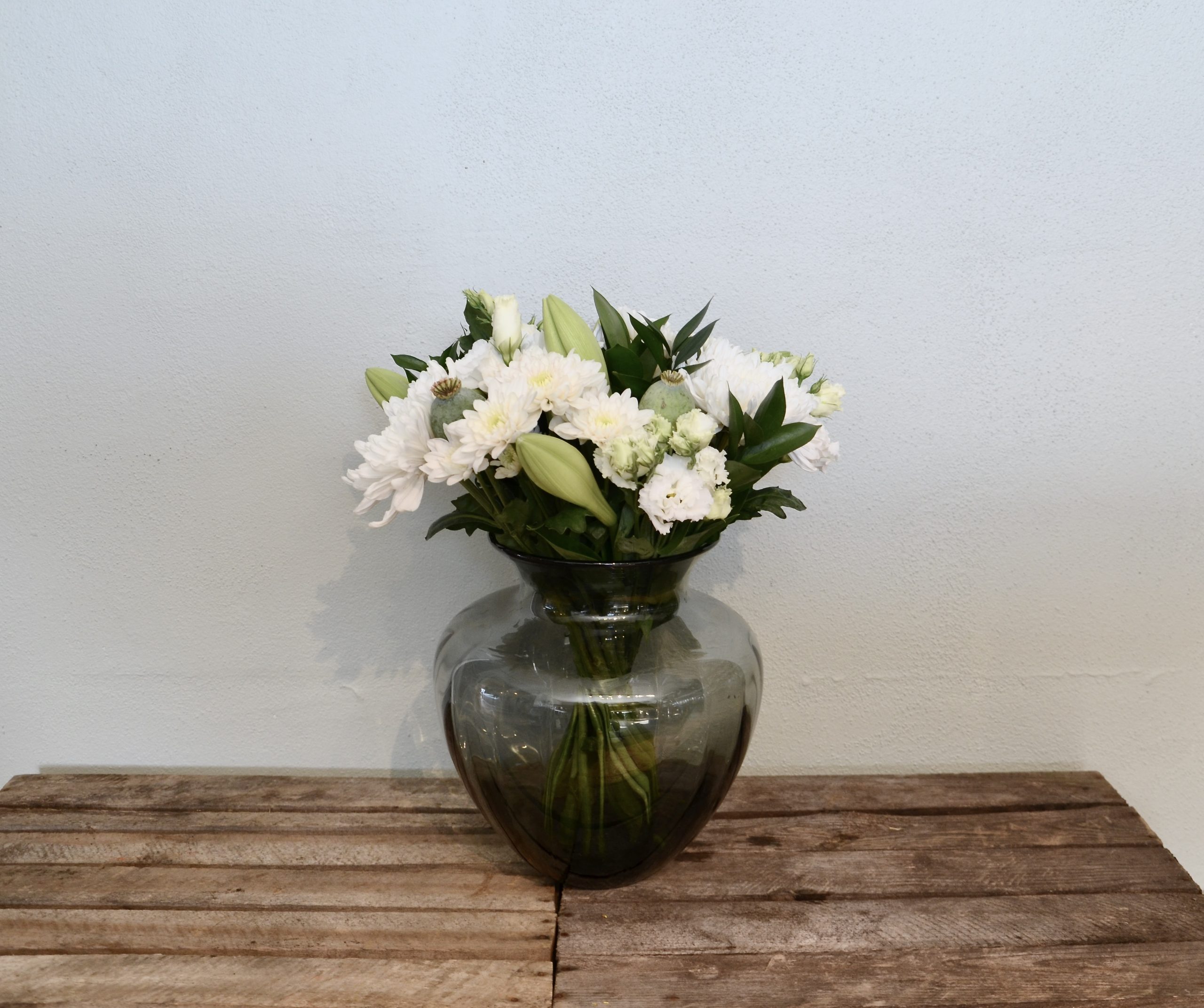 Buketten sammensættes efter tidens udvalg, men altid med forskellige hvide blomster, der giver en smuk buket, der passer til mange forskellige anledninger.