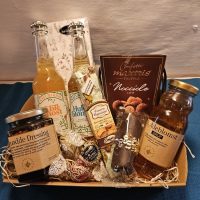 Det viste billede er et eksempel på en gavekurv. Indholdet og udseendet vil variere afhængig af dagens sortiment. Har du særlige ønsker til indholdet, kan du blot notere ved bestilling.
