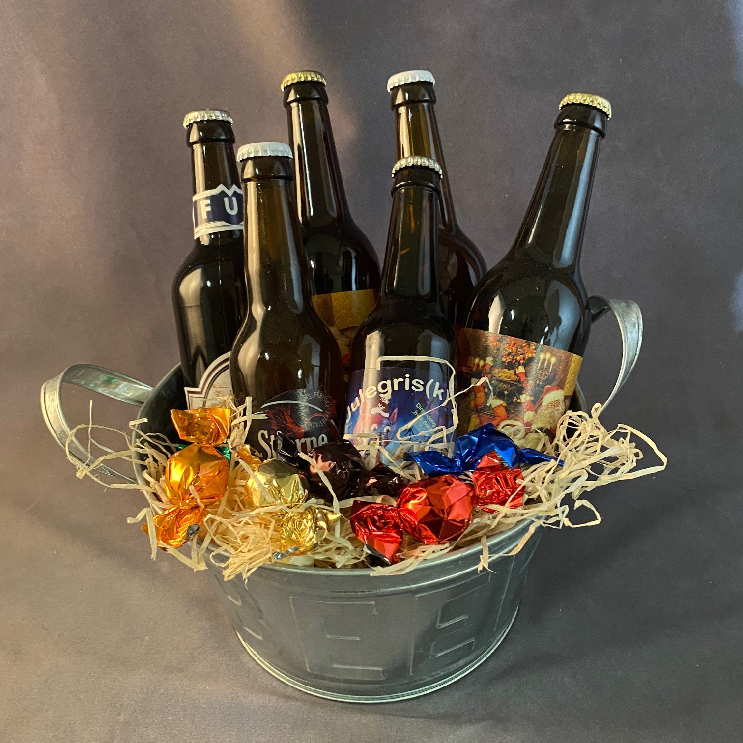 Ølgave pakket i zinkspand, påtrykt BEER. Med variation af danske juleøl. 4 x 50 cl. Og 2 x 33 cl. med lidt chokoladekugler til pynt.