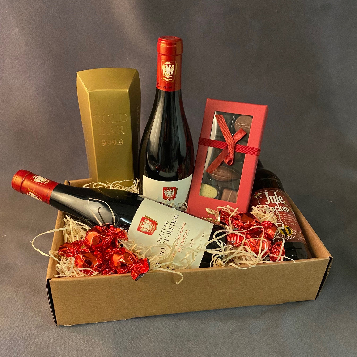 Gavekurv med god Rhône rødvin, juleøl, fyldte chokolader, guldbarre i marcipan og chokoladekugler med fyld. Det hele er pakket i la facile gavekurv i brun karton og herefter i cellofan med bånd.