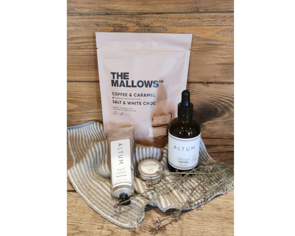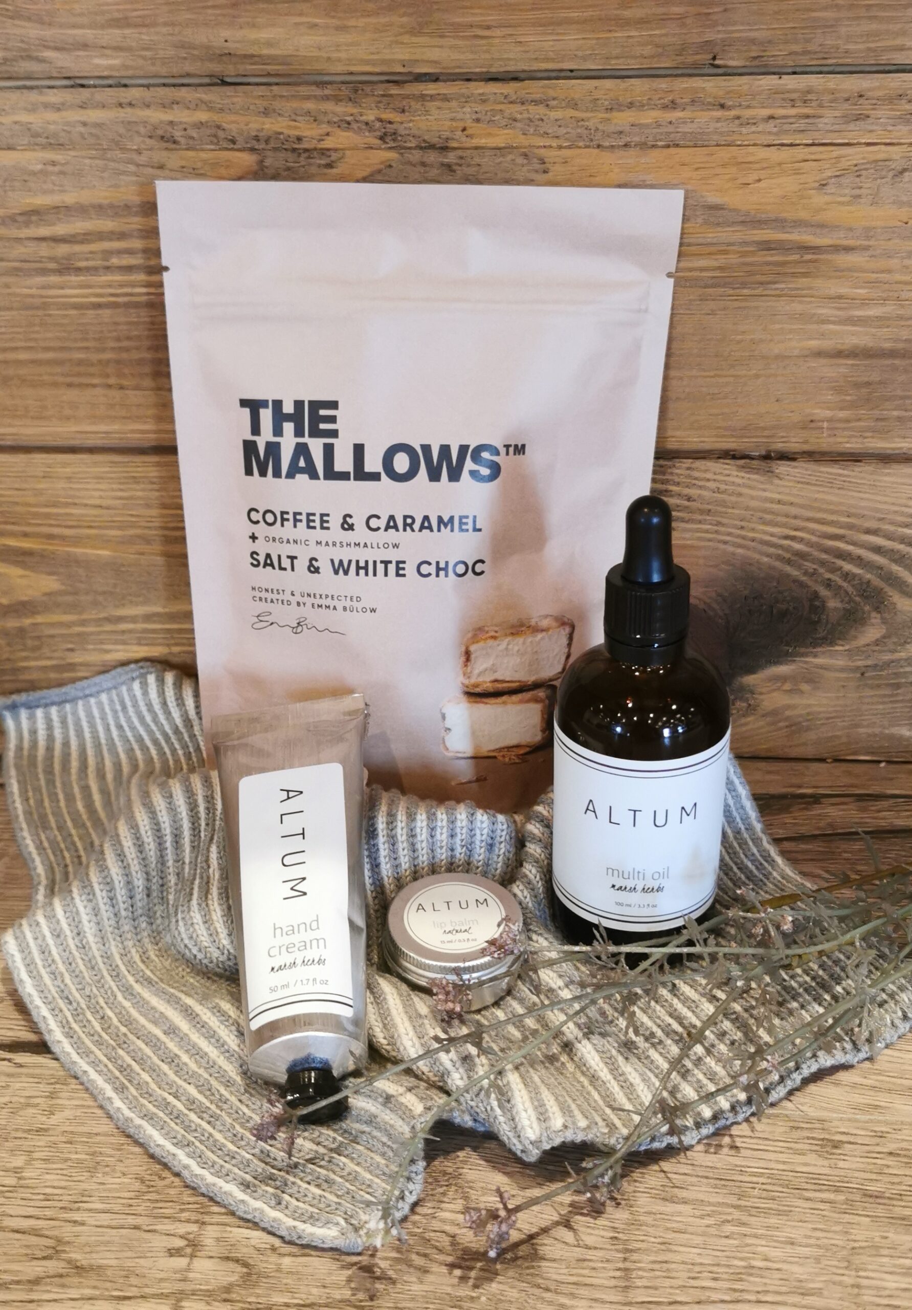 Skøn lille forkælelsespakke med produkter fra Altum spa serie og lidt til den søde tand.