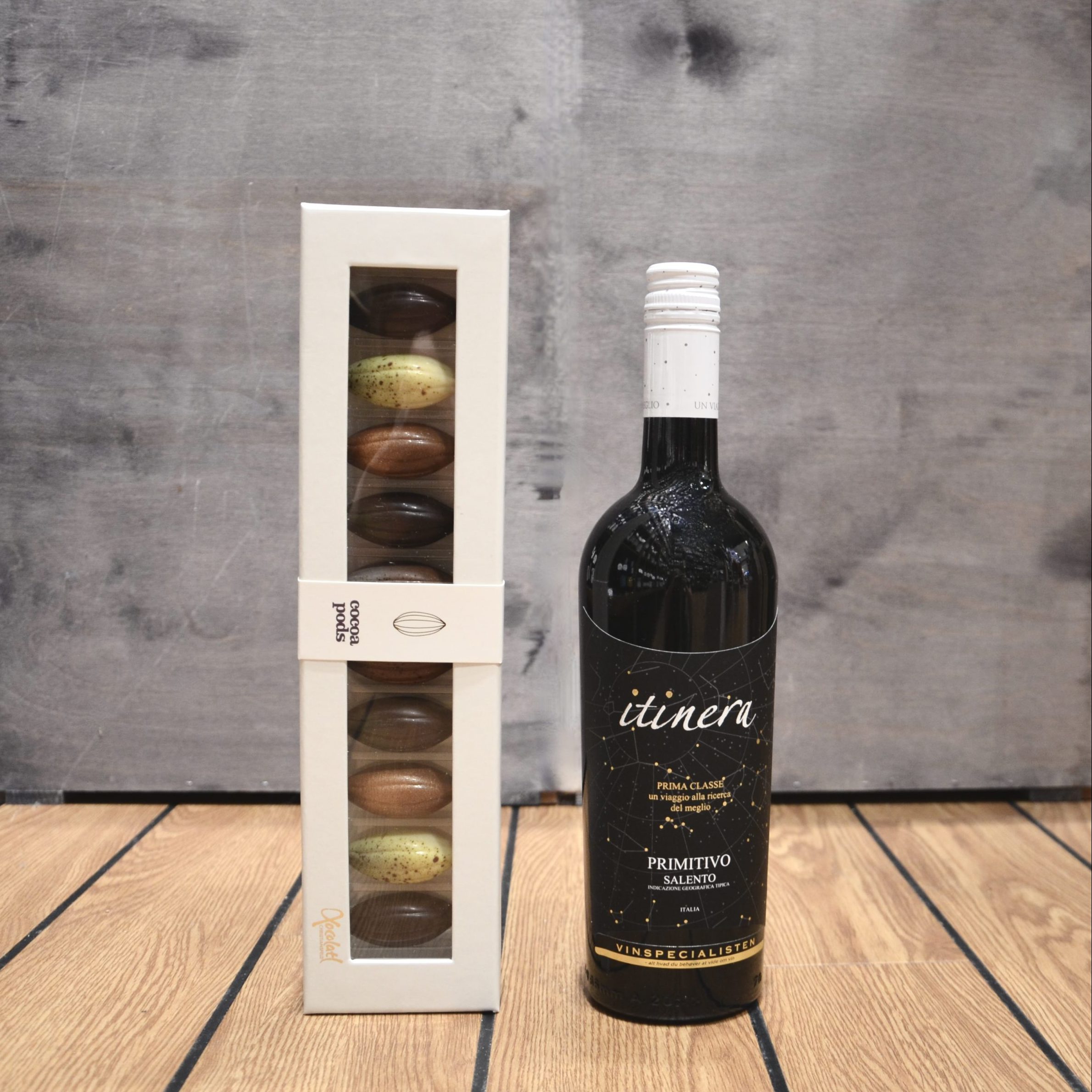 OBS: Billedet er et eksempel på en flaske rødvin og dagens chokolade. Vi håndplukker de bedste produkter fra hylderne der matcher det valgte budget.