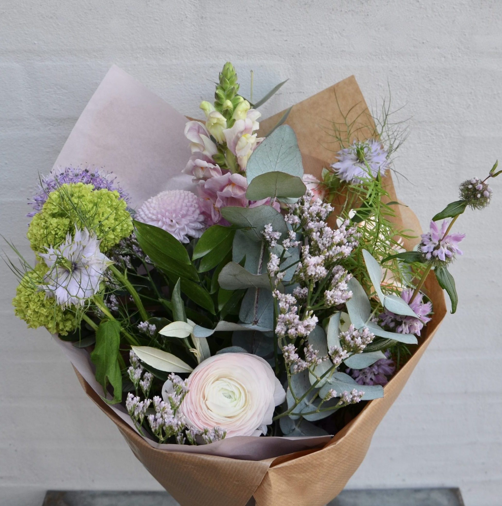 Billedet er blot eksempl på en buket i sarte farver. Farve- og blomsterudvalg kan variere, men du er mere end velkommen til at notere dine ønsker, så vil vi altid gøre hvad vi kan for at matche det 🙂