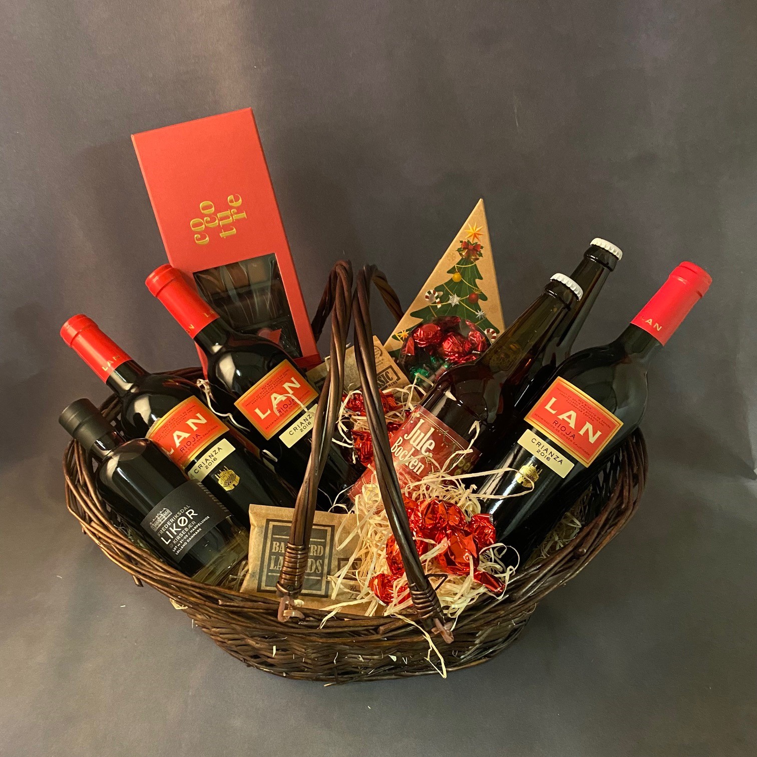 Stor julegavekurv med 3 gode flasker rødvin, 2 asst. Danske juleøl 50 cl., 255 gram Cocoture gaveæske med chokolade og lækkerier, juletræ gaveæske med fyldte chokoladekugler, 2 asst. Bagsværd lakrids plader, Kirsebærlikør fra Frederiksdal. Det hele er pakket i stor fletkurv med cellofan.