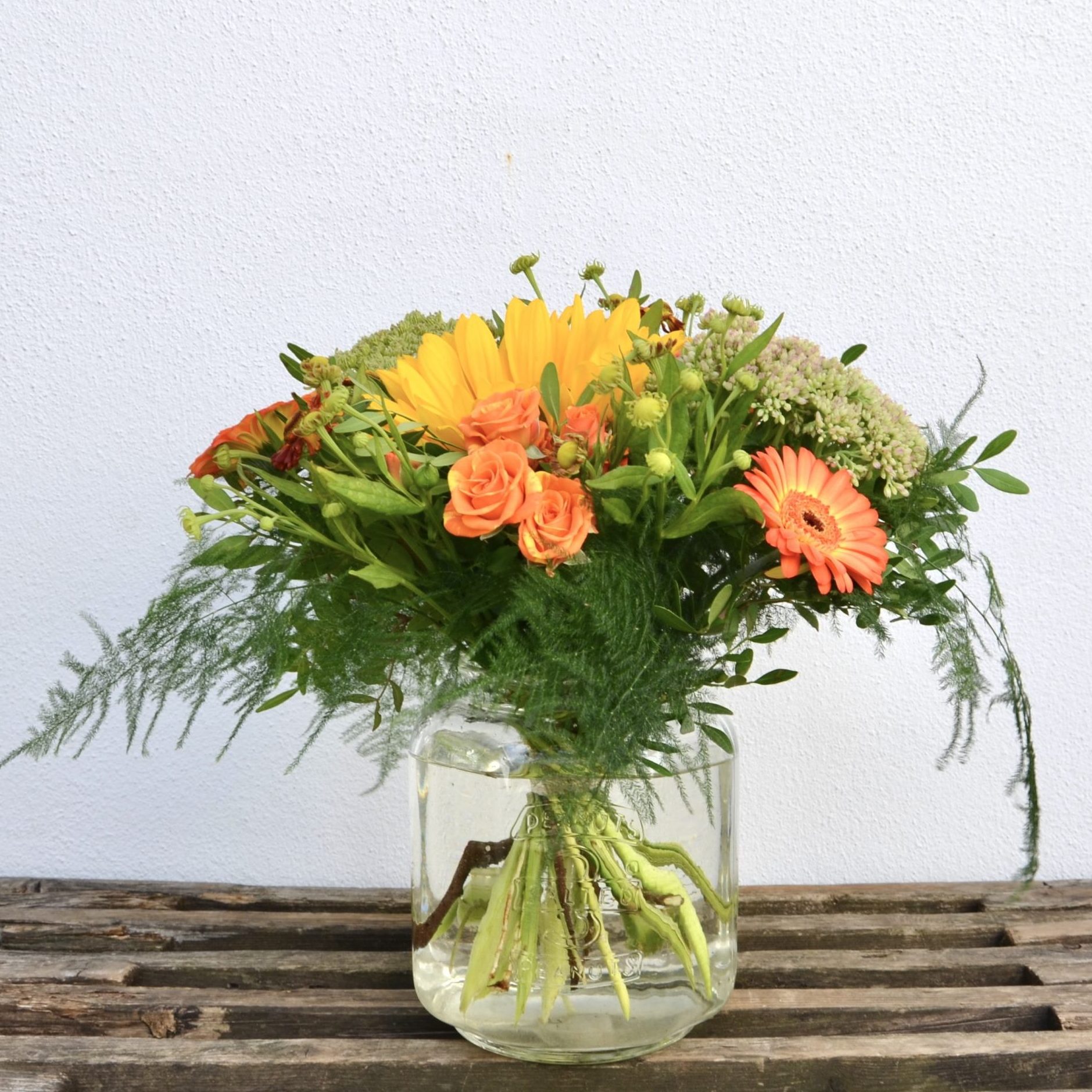 De enkelte blomster kan afvige fra det viste eksempel, da vi altid udvælger dagens og sæsonens pæneste og mest friske blomster. Udtrykket vil dog altid matche bedst muligt. Har du særlige ønsker, noter det blot ved bestilling.